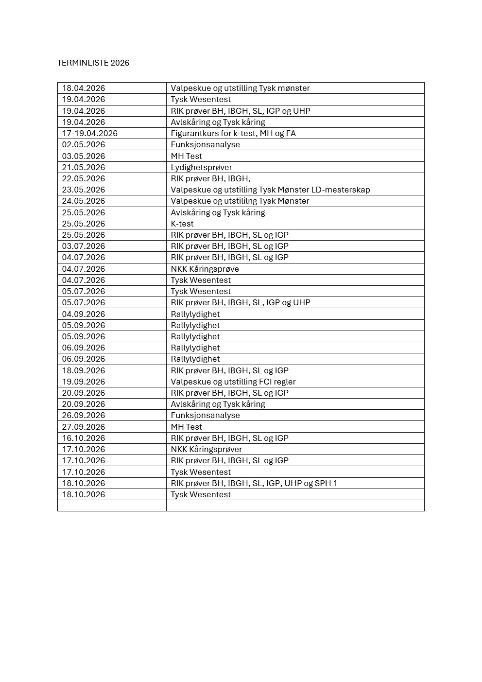 RIK prøver - unntatt Utholdenhetsprøve, sporhundprøve 1 & 2. |